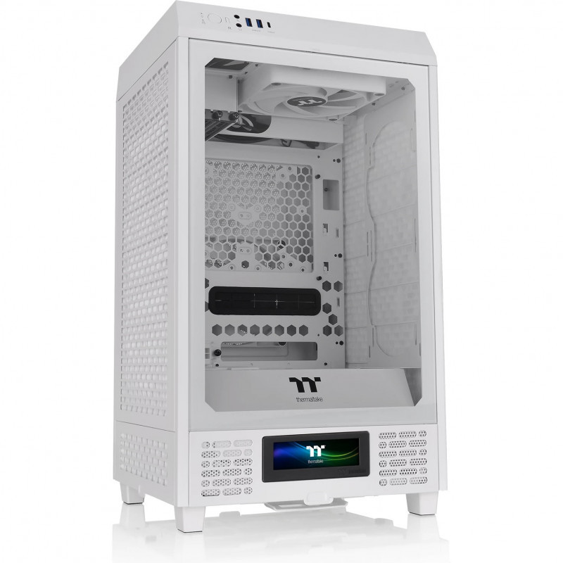 "Thermaltake The Tower 200. Form factor: Mini Tower, Type: PC, Product colour: White. Power supply location: Bottom. Rear fans diameters supported: 120,140 mm, Top fans diameters supported: 120,140 mm, Top radiator sizes supported: 120,140 mm. Supported HDD sizes: 2.5,3.5"". Width: 300 mm, Depth: 280 mm, Height: 537 mm"\n"The Tower 200 Snow is a mini-ITX case with a vertical case design that offers fantastic viewing. It comes with two pre-installed CT140 White fans, each 140mm wide, for exceptional thermal efficiency. It also has enough space for a 4090 GPU and a standard-size PSU, fitting all your high-end components. Moreover, The Tower 200 Snow is compatible with a separately sold LCD panel kit with a 3.9"" LCD display to maximize the PC's visual effects to its full potential."
