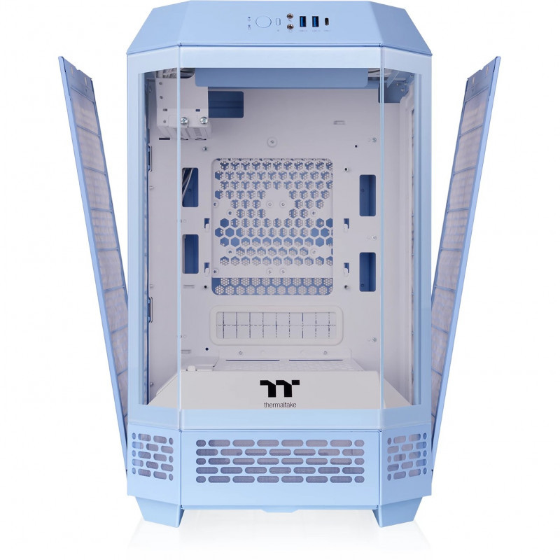 "Thermaltake The Tower 250 Hydrangea Blue. Form factor: Mini Tower, Type: PC, Product colour: Blue. Display type: LCD, Display diagonal: 9.91 cm (3.9""), Display resolution: 128 x 480 pixels. Front fans installed: 2x 120 mm, Front fans diameters supported: 120 mm, Side fans diameters supported: 120,140 mm. Supported HDD sizes: 2.5,3.5"". Width: 300 mm, Depth: 281 mm, Height: 506 mm"\n"The Tower 250 Hydrangea Blue is the latest mini-ITX case in the Tower series, featuring a classic vertical design with an octagonal prism shape. The small form factor doesn't compromise on cooling performance, as it includes two CT120 fans and supports up to eight 120mm fans, as well as a 360mm AIO radiator on the right side. Users can also choose to add the separately sold 3.9"" LCD Screen Kit and Chassis Stand Kit to make The Tower 250 Hydrangea Blue more visually appealing.