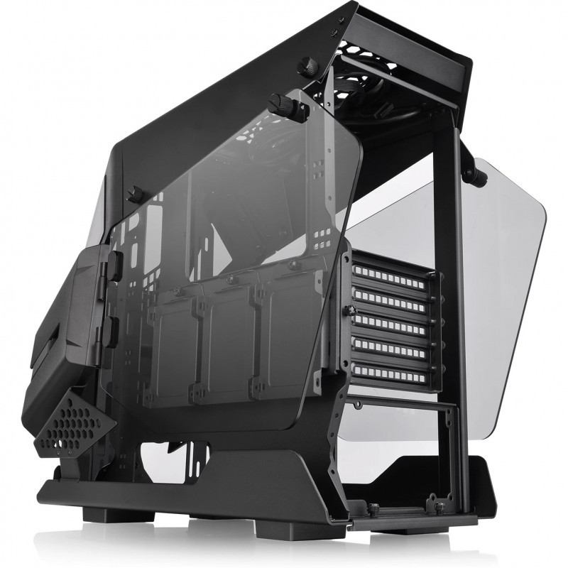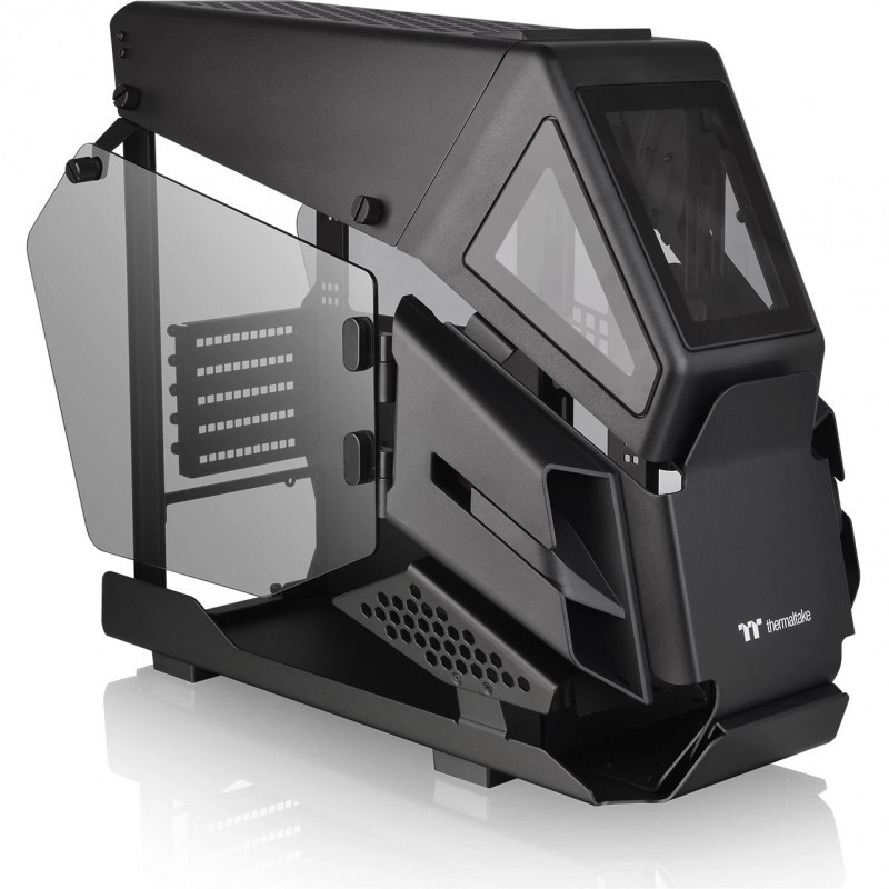 "Thermaltake AH T200. Form factor: Micro Tower, Type: PC, Product colour: Black. Power supply location: Bottom, Supported power supply form factors: PS2. Front fans diameters supported: 120,140 mm, Top fans diameters supported: 120,140 mm, Front radiator sizes supported: 120,140,240,280 mm. Supported HDD sizes: 2.5,3.5"". Width: 282 mm, Depth: 551.5 mm, Height: 444.2 mm"\n"The Thermaltake AH T200 is a helicopter styled open frame micro chassis which comes with two 4mm tempered glass panels on left and right sides and can support motherboards up to Micro ATX.