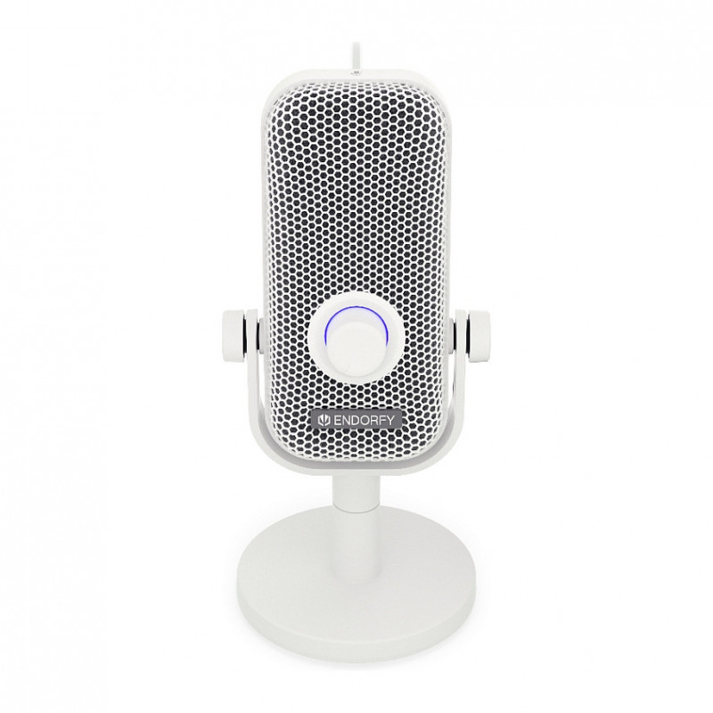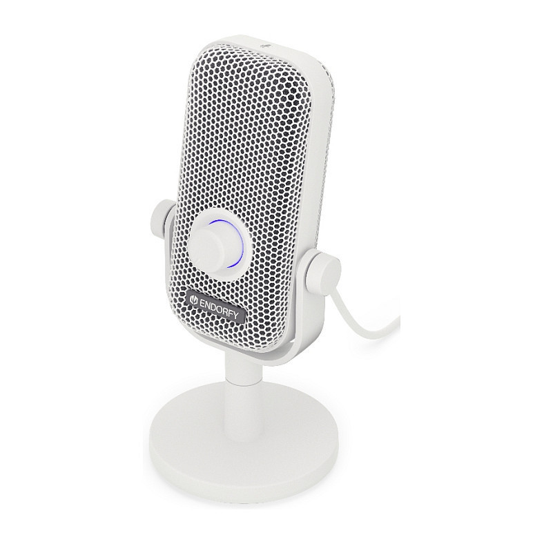 "ENDORFY Solum Voice S. Type: PC microphone, Microphone frequency: 30 - 18000 Hz, Bit rate: 24 bit. Connectivity technology: Wired, Device interface: USB/3.5 mm, USB connector type: USB Type-C. Product colour: White, Market segment: Consumer, Control type: Rotary, Touch. Power source: USB. Width: 74 mm, Depth: 74 mm, Height: 170 mm"\n"Stream, chat and record podcasts with the Solum Voice S Onyx White. The RGB-illuminated microphone takes up little space, providing you with room for vlogging, gaming and chatting with friends. It’s also compatible with ENDORFY microphone arms, so you can adjust it to the most comfortable position.