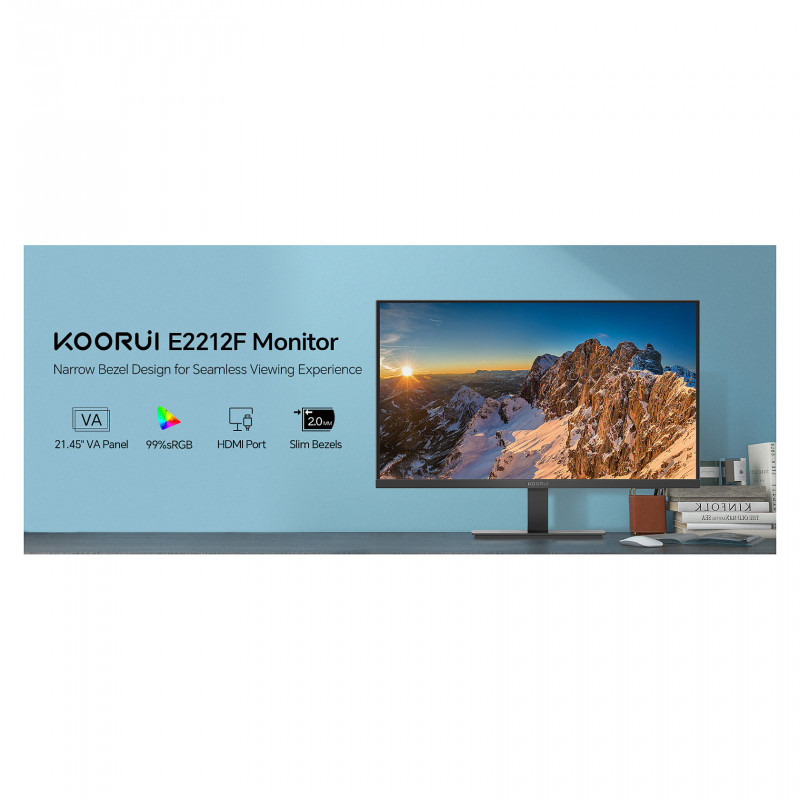 "Koorui E2212F. Display diagonal: 54.5 cm (21.4""), Display resolution: 1920 x 1080 pixels, HD type: Full HD, Response time: 6 ms, Native aspect ratio: 16:9, Viewing angle, horizontal: 178°, Viewing angle, vertical: 178°. VESA mounting. Product colour: Black"\n