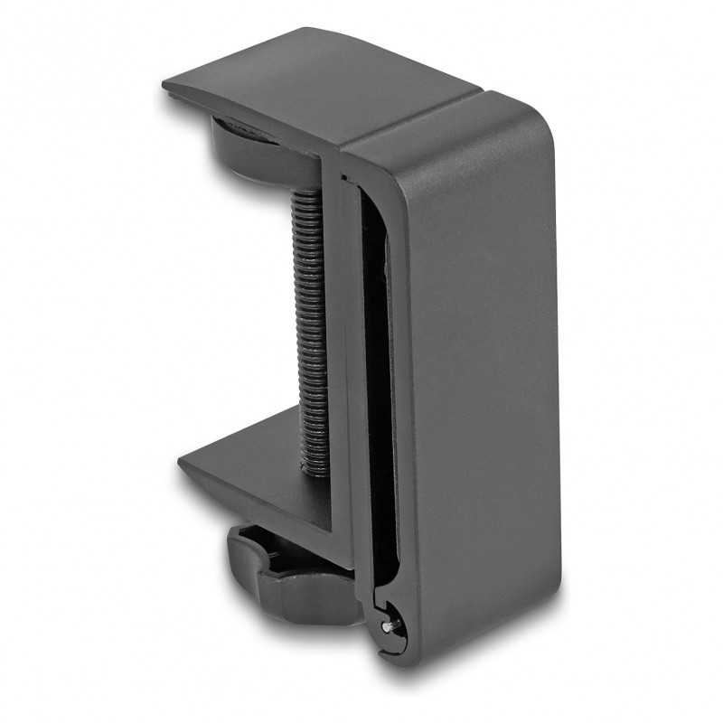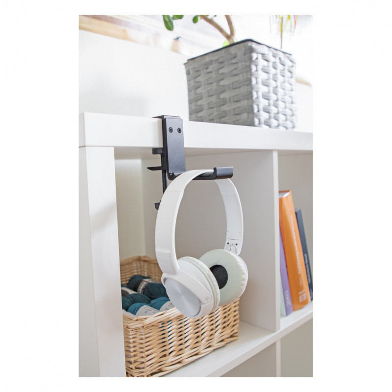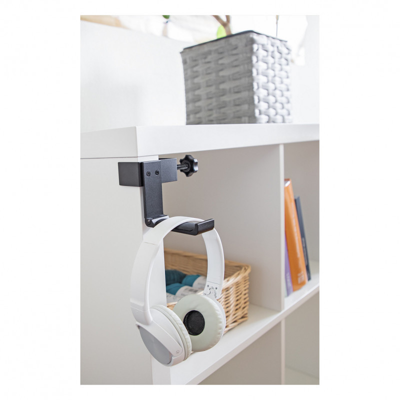 "DeLOCK Headphone Holder adjustable for desk mounting aluminium black. Product type: Headphone holder, Material: Aluminium, Product colour: Black"\n"This holder by Delock enables to hang headphones and store them safely. The holder is ideal for desk mounting and is easy to install.
