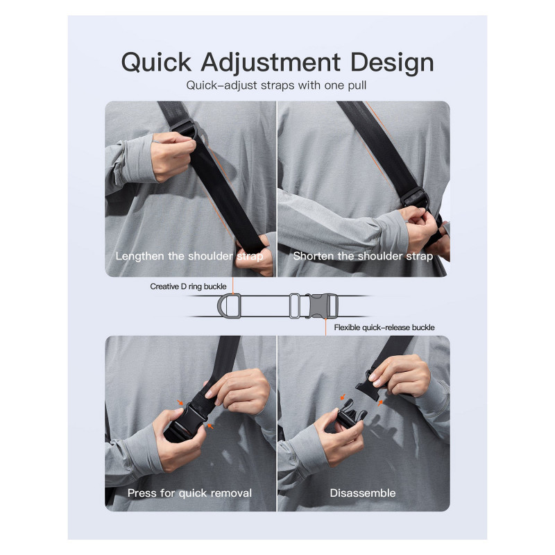 Quick Adjustment:The shoulder strap of this crossbody bag adopts a combination of square and D-ring buckles, allowing for smooth adjustment of the strap length (29–48 inches) to meet various wearing needs. Additionally, the sling is equipped with a smooth quick-release buckle for easy and fast removal. The interior is lined with bright orange fabric, making it easy to quickly locate your items