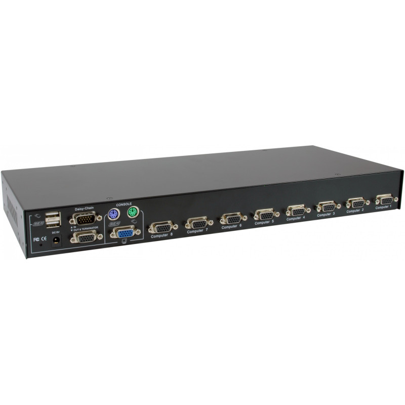 "LevelOne 8-Port PS/2-USB VGA KVM Switch. Keyboard port type: USB, PS/2, Mouse port type: USB, PS/2, Video port type: VGA. Maximum resolution: 2048 x 1536 pixels, Scan interval: 10,15,20,25,30,35,40,45,50,55,60,70,80,90 s, Auto scan delay (min): 10 s. Product colour: Black, Rack capacity: 1U, Housing material: Metal. Power source: DC, Input voltage: 9 V, Input current: 1 A. Windows operating systems supported: Windows 2000, Windows 7, Windows 7 Enterprise, Windows 7 Enterprise x64, Windows 7 Home Basic,..."\n"The LevelOne KVM-3208 8-port combo KVM switch enables users to control and manage a server farm or computers connected to the KVM switch with either the local console or remote console port.Local ConsoleThe KVM-3208 Combo KVM Switch is easy to connect to a keyboard and mouse with a VGA monitor through the local console port. This enables a user to control systems connected to the KVM switch directly.Remote ConsoleIn order to make use of the remote control feature.
