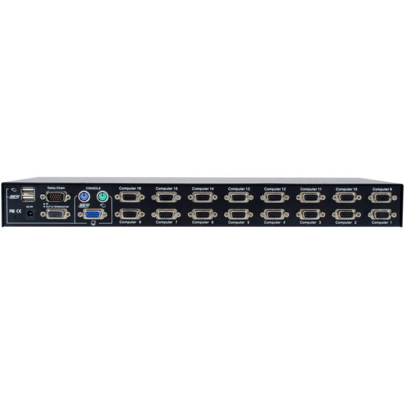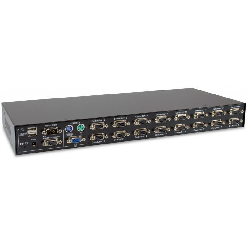 "LevelOne 16-Port PS/2-USB VGA KVM Switch. Keyboard port type: USB, PS/2, Mouse port type: USB, PS/2, Video port type: VGA. Maximum resolution: 2048 x 1536 pixels, Scan interval: 35,70,10,40,80,15,45,90,20,50,25,55,30,60 s, Auto scan delay (min): 10 s. Product colour: Black, Rack capacity: 1U, Housing material: Metal. Power source: DC, Input voltage: 9 V, Input current: 1 A. Windows operating systems supported: Windows 7 Professional x64, Windows Vista Enterprise x64, Windows 7 Starter, Windows Vista Home..."\n"The LevelOne KVM-3216 16-port combo KVM switch enables users to control and manage a server farm or computers connected to the KVM switch with either the local console or remote console port.Local ConsoleThe KVM-3216 Combo KVM Switch is easy to connect to a keyboard and mouse with a VGA monitor through the local console port. This enables a user to control systems connected to the KVM switch directly.Remote ConsoleIn order to make use of the remote control feature.
