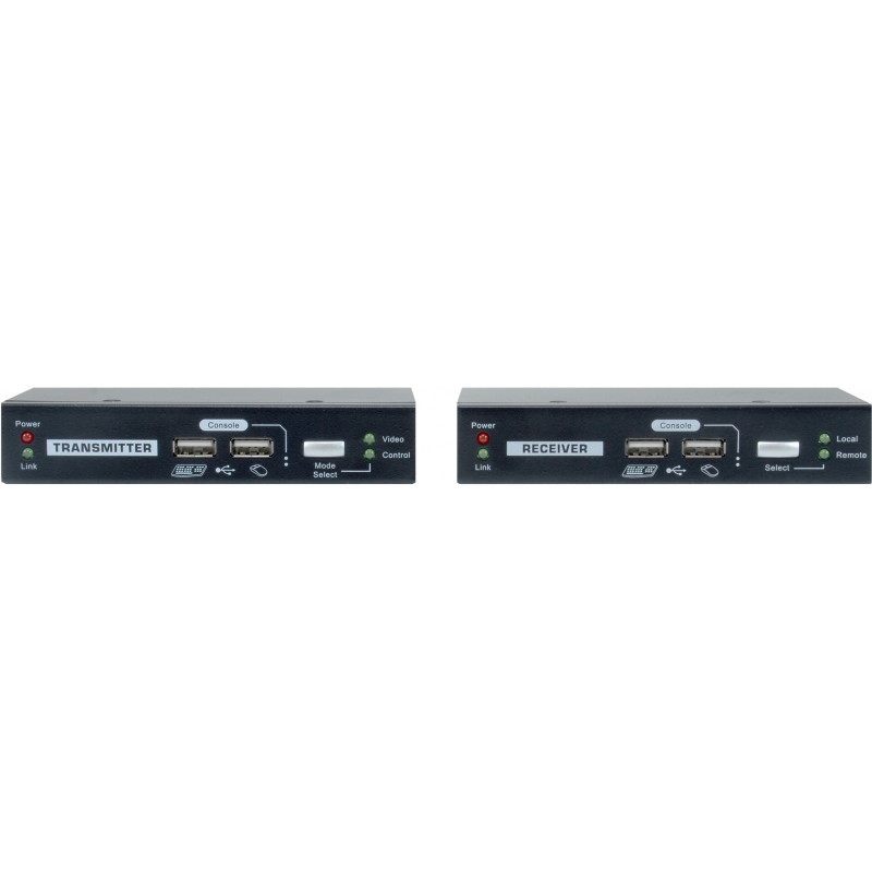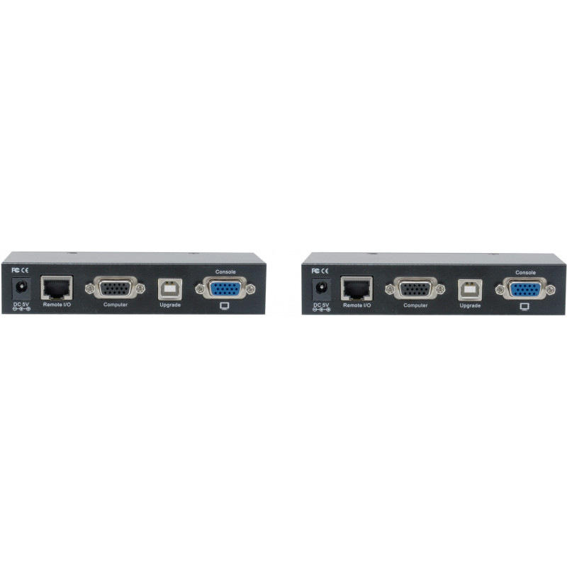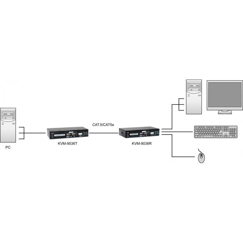 "LevelOne KVM over Cat.5 Extender. Type: Transmitter & receiver, Connectivity technology: Wired, Maximum transfer distance: 100 m. Transmitter video port type: VGA, Transmitter local video port type: VGA, Transmitter local keyboard/mouse port type: USB. Receiver local video port type: VGA, Receiver local keyboard/mouse port type: USB. USB port type: USB Type-B. Transmitter width: 13.1 cm, Transmitter depth: 6.5 cm, Transmitter height: 2.6 cm"\n"The KVM-9036 Cat.5 USB Extender Kit is a pair of devices (Transmitter and Receiver) for highdensity applications where you want full use of the keyboard, mouse, and monitor, but there is no room for a server nearby.It allows users to access a computer, server or KVM switch up to 100m away. Or for applications where you want to put all computers in a safe place, all that is needed on the desktop is a single keyboard, monitor, and mouse.KVM-9036 has auto-adjustable RGB gain/delay control capability for superior video performance.