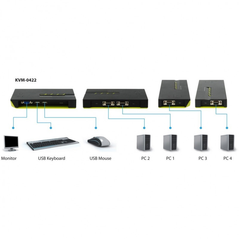 The LevelOne KVM-0422 connects four computer systems to a single USB keyboard, USB mouse and monitor.