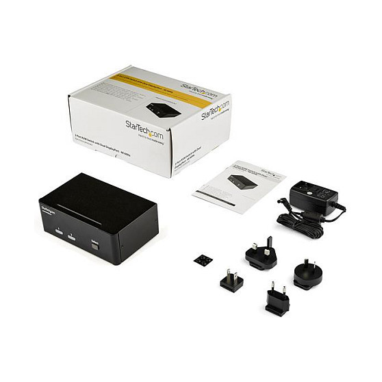 "StarTech.com 2-Port DisplayPort Dual-Monitor KVM Switch - 4K 60Hz. Keyboard port type: USB, Mouse port type: USB, Video port type: DisplayPort. HD type: 4K Ultra HD, Maximum resolution: 3840 x 2160 pixels. Product colour: Black, Certification: CE, FCC, REACH, TAA. Input voltage: 100 - 240 V, Input current: 1.5 A, Output voltage: 12 V. Compliance certificates: RoHS"\n"Access two dual-monitor computers and two shared USB peripherals from a single workstation