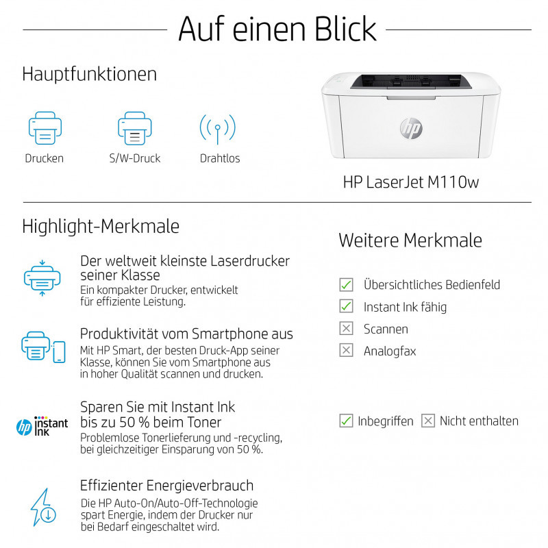 "HP LaserJet M110w Printer. Print technology: Laser. Number of print cartridges: 1, Maximum duty cycle: 8000 pages per month. Maximum resolution: 600 x 600 DPI. Maximum ISO A-series paper size: A4. Print speed (black, normal quality, A4/US Letter): 20 ppm. Display: LED. Network ready, Wi-Fi. Product colour: White"\n"Prints efficiently. Fits anywhere. An efficient, high-quality laser printer that fits your space and budget. Get fast printing from HP's smallest laser in its class,[1] plus the time-saving HP Smart app.[2,3] Count on professional-quality laser printing and seamless setup.
