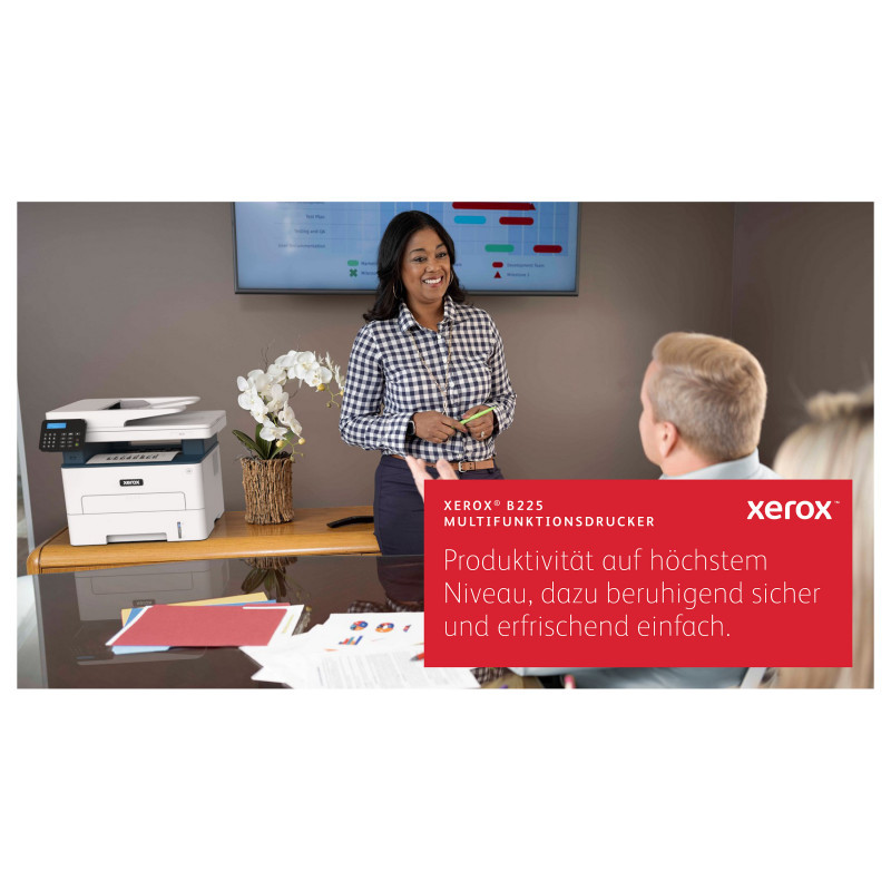 "Xerox B225 A4 34ppm Wireless Duplex Copy/Print/Scan PS3 PCL5e/6 ADF 2 Trays Total 251 Sheets. Print technology: Laser, Printing: Mono printing, Maximum resolution: 1200 x 1200 DPI. Copying: Mono copying, Maximum copy resolution: 600 x 600 DPI. Scanning: Colour scanning, Optical scanning resolution: 1200 x 1200 DPI. Duplex functions: Copy, Print. Maximum ISO A-series paper size: A4. Wi-Fi. Direct printing. Product colour: Blue, White"\n"The Xerox B225 multifunction printer includes built-in Wifi with Wi-Fi Direct and is easy to set up with Xerox® Smart Start Software, so it is ready to work hard right out of the box. Print from your mobile devices with support for Apple AirPrint, Mopria Print Service and Chromebook printing. Designed for small businesses that need to print, copy, and scan. It includes features such as automatic 2-sided printing on letter and legal sized paper, a 50-sheet automatic document feeder, standard paper capacity of 250 sheets, a 1 GHz dual core processor with 512 MB of memory, and monthly print volume up to 2,500 pages, the B225 is a workhorse. Do more with optional Xerox Workflow Central, allowing you to convert documents into other languages, change handwriten messages into shareable text documents, create audio files of hardcopy to listen to on the go, automatically redact content, and convert scans into Microsoft Office Applications. And our Green World Alliance program offers hassle-free toner cartridge recycling.