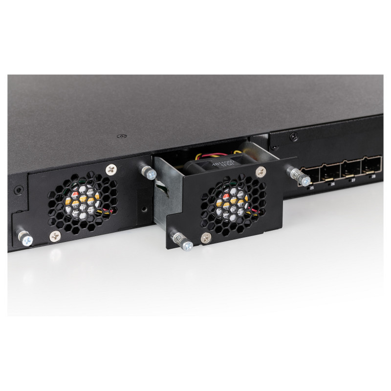The LANCOM XS-6128QF can be operated with up to twohot-swappable PSUs (power supply units). This allows a quick and uninterrupted replacement of defective power supply units. Front-to-back airflow design with swappable fans improves cooling in 19-inch racks and extends the product lifetime. Stacking is a major contribution to highly resilient scenarios.