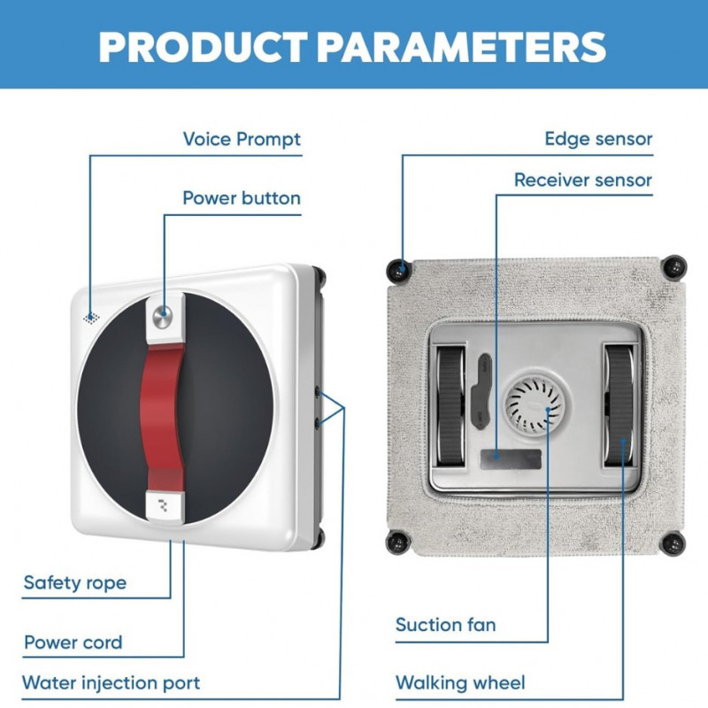 Robotą lengva valdyti – jis turi pažangias navigacijos sistemas, kurios užtikrina tolygų ir kruopštų langų paviršiaus valymą. Kompaktiškas ir elegantiškas dizainas dera prie bet kokios aplinkos. Be to, prietaisas turi saugos funkcijas, kurios užtikrina patikimą darbą net ir ant aukštų langų.