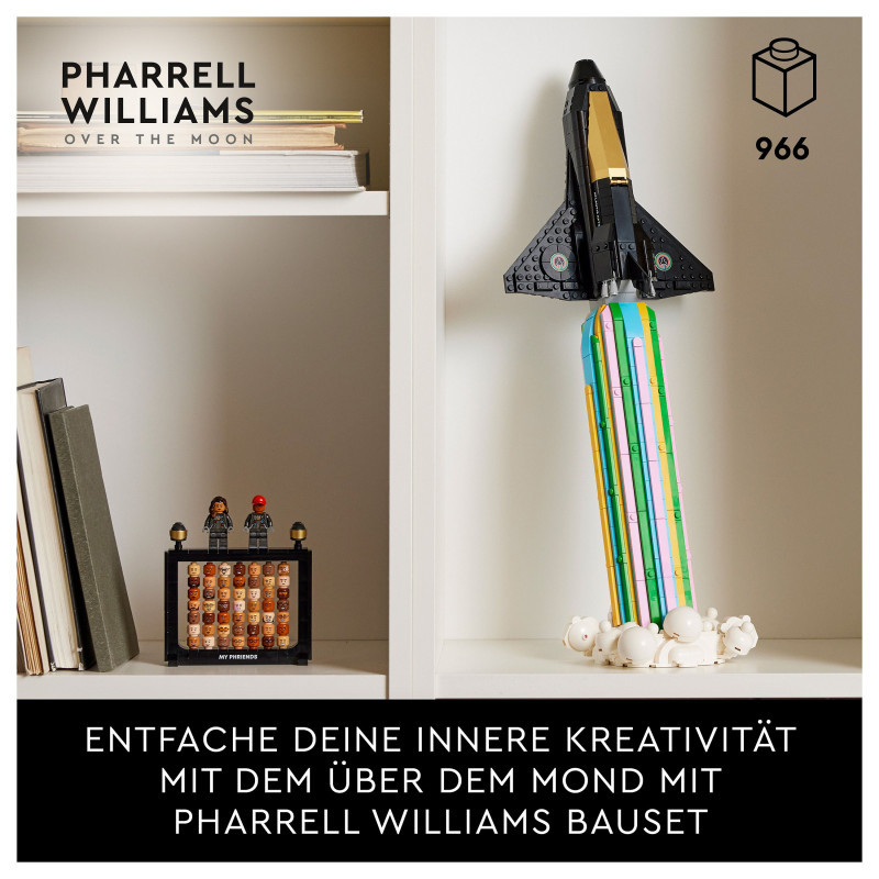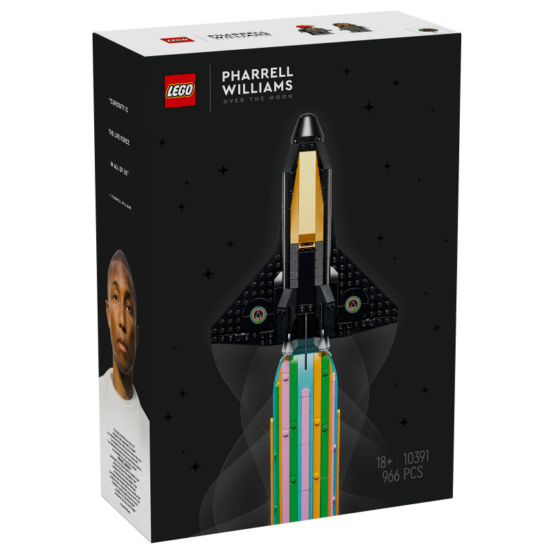 "LEGO Over the Moon with Pharrell Williams. Product type: Building set, Recommended age (min): 18 yr(s), Material: Plastic, Number of pieces: 966 pc(s). Package weight: 1.43 kg"\n"Embark on a fantastic journey with the LEGO® Icons Over the Moon with Pharrell Williams (10391) building project for adults. As a child, Pharrell’s creative optimism and his surroundings at Atlantis Apartments fuelled his curiosity and provided the launchpad that helped him build the future he wanted for himself, and others like him. The inspiring display model depicts a space shuttle heading for the stars, propelled by a colourful jet stream. This set also includes Pharrell Williams and Helen Williams astronaut minifigures, plus 49 interchangeable character heads.