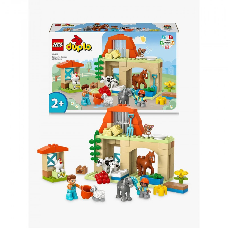 "LEGO DUPLO Caring for Animals at the Farm. Product type: Building set, Recommended age (min): 2 yr(s), Material: Plastic, Number of pieces: 74 pc(s). Package weight: 1.2 kg"\n"Know a toddler who loves farm playsets? The Caring for Animals at the Farm (10416) set is the ideal gift for any little animal-lover. This kids’ learning toy for toddlers aged 2 years old and over comes with 8 LEGO® DUPLO® animal figures – including horse, sheep, cow and chicken figures – to delight any toddler who loves real-life role-play toys and making new farmyard friends.