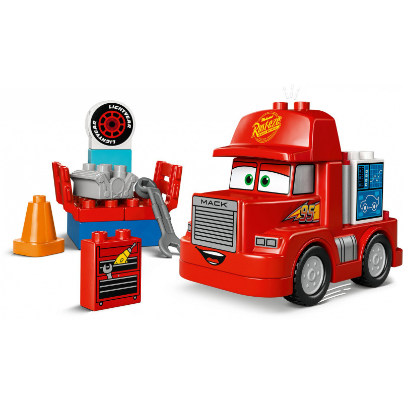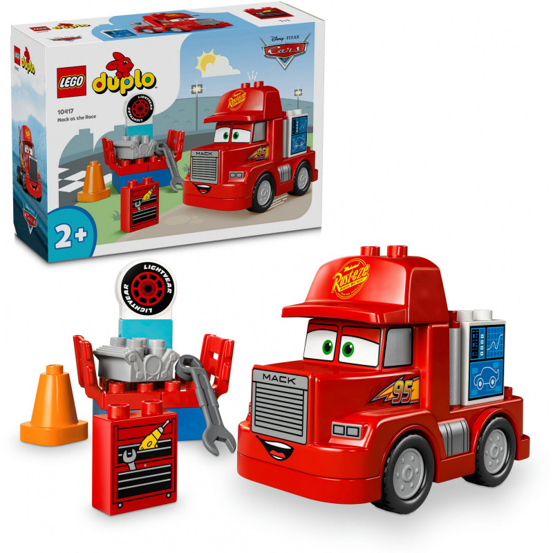 "LEGO DUPLO Mack at the Race. Product type: Building set, Recommended age (min): 2 yr(s), Material: Plastic, Number of pieces: 14 pc(s). Package weight: 340 g"\n"Turbocharge playtimes for preschool vehicle fans aged 2 years old and over with this Mack at the Race (10417) build-and-play toddler toy inspired by the Disney and Pixar Cars films and featuring a big red buildable toy truck.