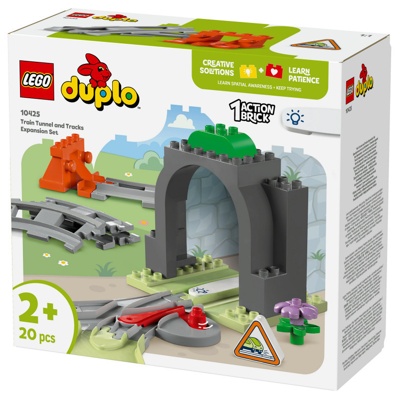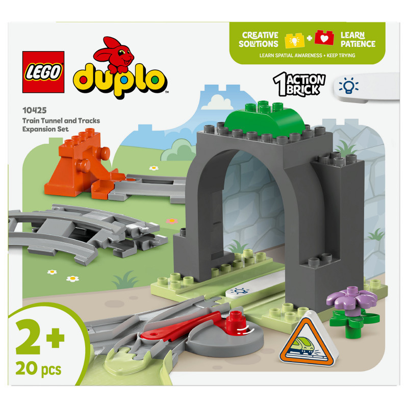 "LEGO DUPLO Train Tunnel and Tracks Expansion Set. Product type: Building set, Recommended age (min): 2 yr(s), Material: Plastic, Number of pieces: 20 pc(s). Package weight: 708 g"\n"Extend toddlers’ train adventures with the Train Tunnel and Tracks Expansion Set (10425) toy for toddlers. Little ones aged 2+ grow their learning adventures as they add a tunnel and extra track to their LEGO® DUPLO® Town interactive toy train sets (10427 and 10428, sold separately).