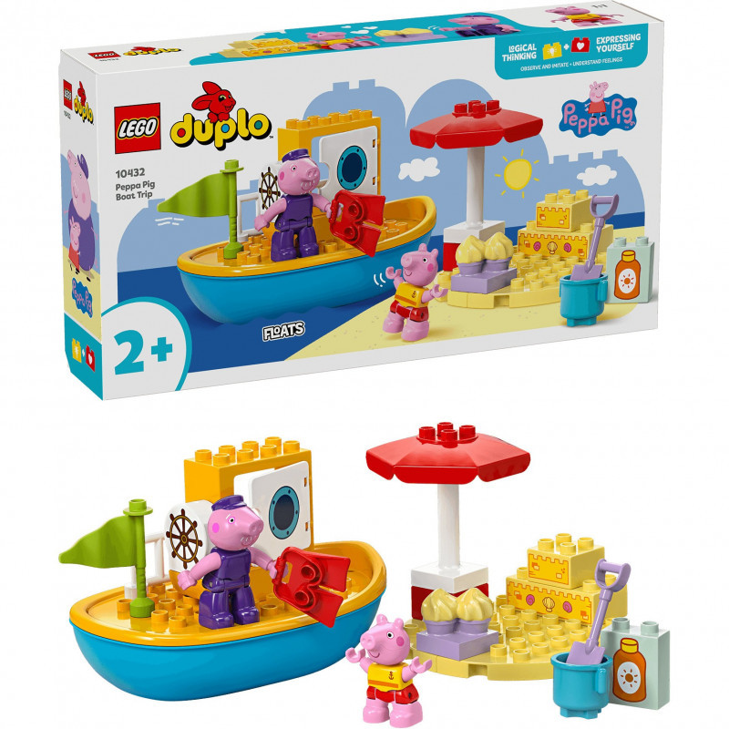 "LEGO Peppa Pig Boat Trip. Product type: Building set, Recommended age (min): 2 yr(s), Material: Plastic, Number of pieces: 23 pc(s). Package weight: 442 g"\n"All aboard the LEGO® DUPLO® Peppa Pig Boat Trip Toy (10432) for hours of joyful preschool learning. Girls and boys aged 2+ join the Grandpa Pig and Peppa Pig figures as they head to the beach with his boat.