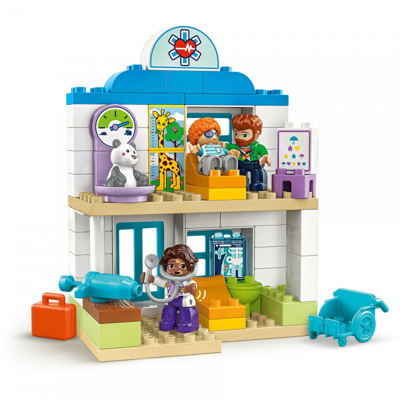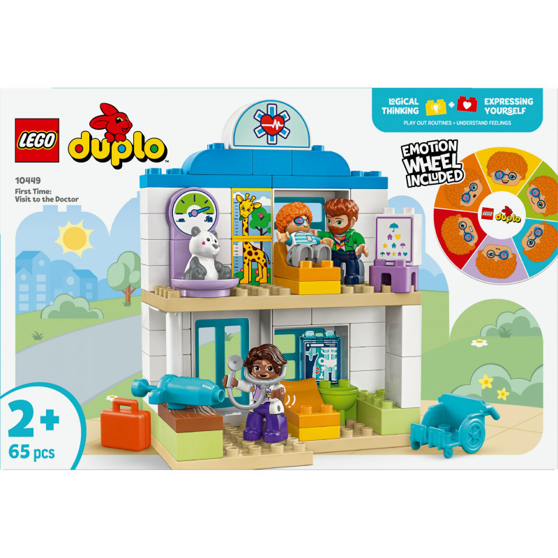 "LEGO First Time: Visit to the Doctor. Product type: Building set, Recommended age (min): 2 yr(s), Material: Plastic, Number of pieces: 65 pc(s). Package weight: 1 kg"\n"Toddlers aged 2 plus explore their emotions with the LEGO® DUPLO® Town First Time: Visit to the Doctor (10449) playset. This building toy for kids helps toddlers practice fine motor skills, role-play stories and feel empathy for others as they pretend-play being the young patient going for a health check.