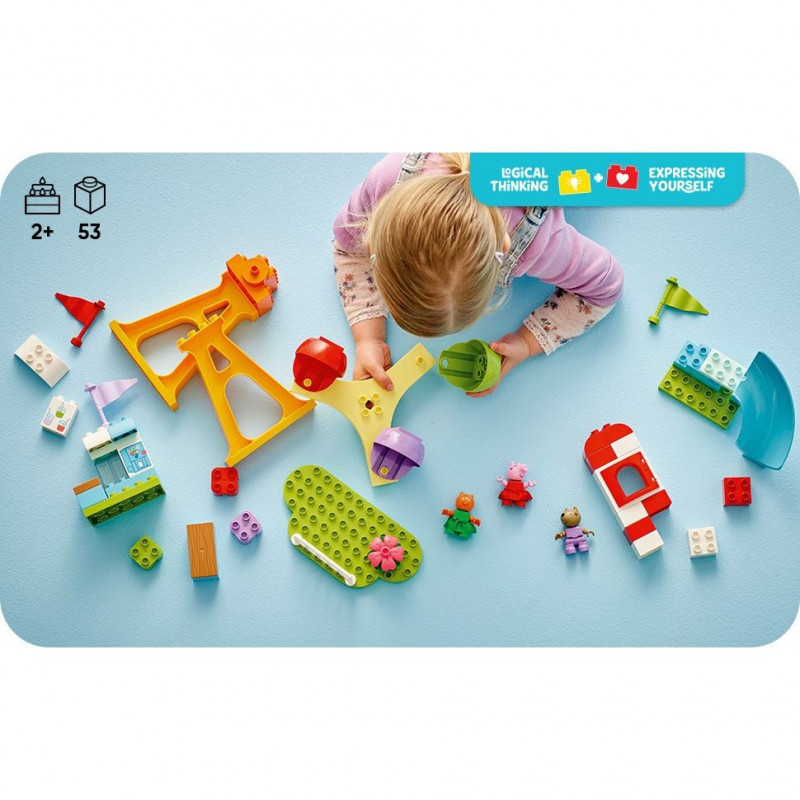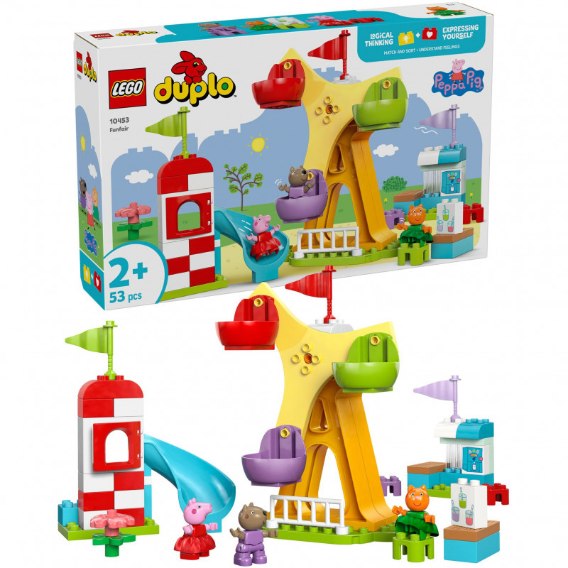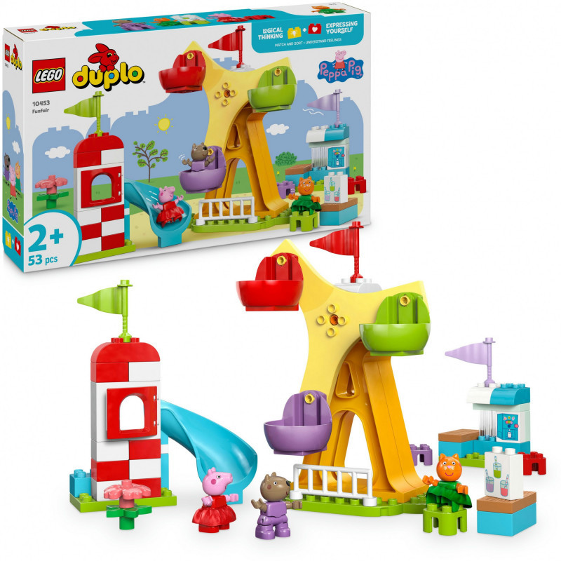 "LEGO Funfair. Product type: Building set, Recommended age (min): 2 yr(s), Material: Plastic, Number of pieces: 53 pc(s). Package weight: 952 g"\n"Fill playtimes with dynamic fun and adventure with the LEGO® DUPLO® Peppa Pig Funfair (10453) toddler toy. Preschoolers aged 2 plus pretend-play a day at an amusement park in the company of recognisable toy characters from their favourite show. They’ll love to send the Peppa Pig, Candy Cat and Danny Dog figures spinning as they push this preschool playset’s rotating big wheel. Then they can play out taking turns to whizz down the slide toy.