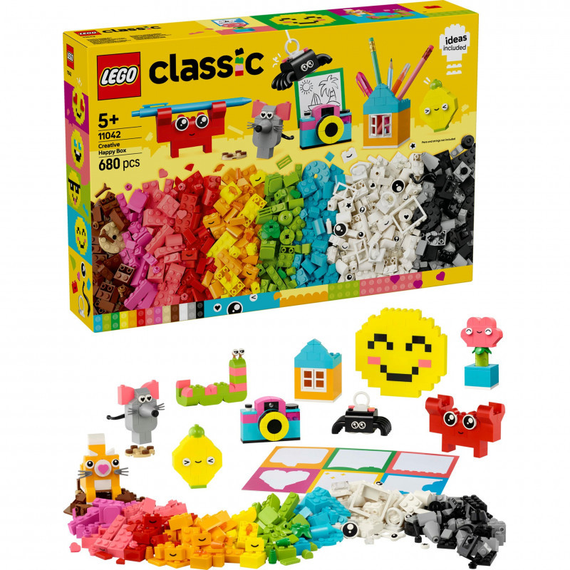 "LEGO Creative Happy Box. Product type: Building set, Recommended age (min): 5 yr(s), Material: Plastic, Number of pieces: 680 pc(s). Package weight: 931 g"\n"Give a young builder the best start with LEGO® Classic Creative Happy Box (11042). With 680 colourful bricks and special elements, plus an inspirational guide, the happy building will never end.