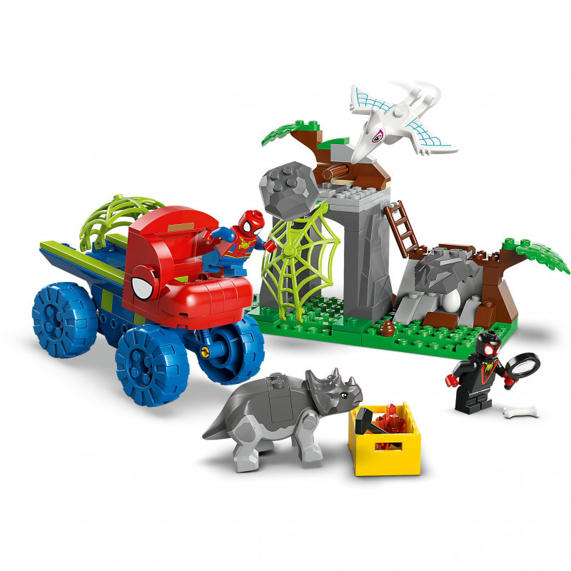 This buildable LEGO® playset includes Spidey and Miles ""Spin"" Morales minifigures and 2 buildable dinosaur figures: Ghost-Spider as a pterodactyl and Rhino as a triceratops. There’s Spidey’s LEGO Dino Crawler truck with a large web attached to the rear, a trigger-operated rock-fall feature, a dinosaur egg to reveal, and a web that can be lowered to trap the villain. Intuitive instructions are provided in the form of a colourful picture-story guide and separate bags contain bricks and a large Starter Brick to make construction quick and easy.