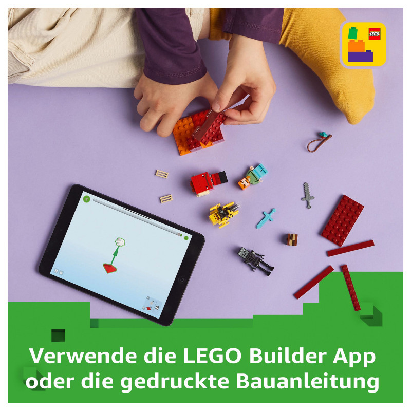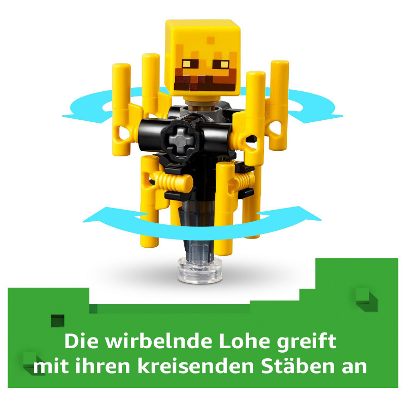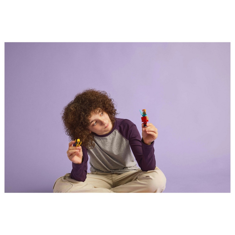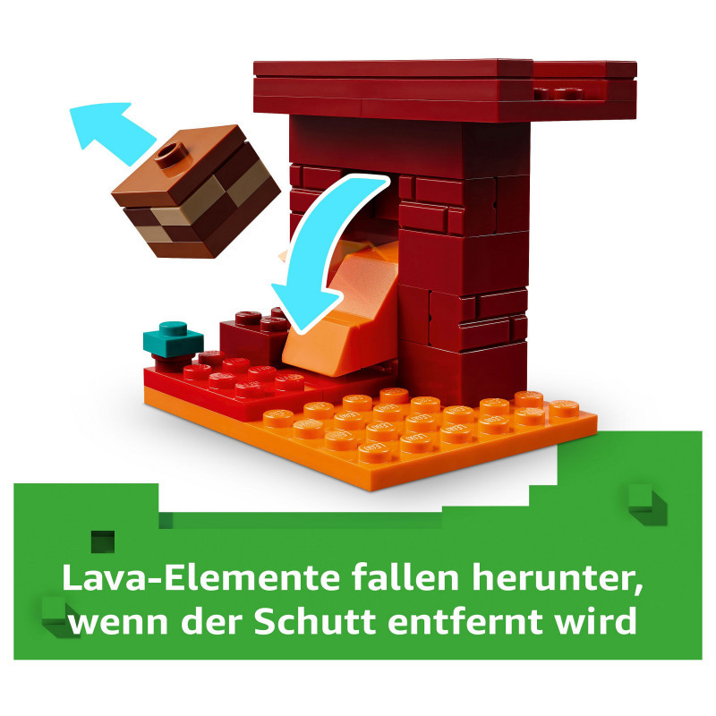 LEGO® Minecraft® Nether fortress action – Players will need their skills to collect ancient debris, escape a lava fall, battle mobs and ride a Minecraft figure to safety