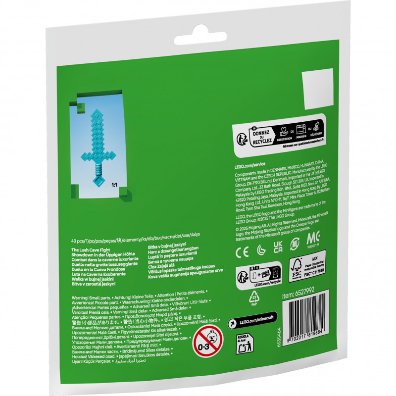 "LEGO The Lush Cave Fight. Product type: Building set, Recommended age (min): 6 yr(s), Material: Plastic, Number of pieces: 40 pc(s). Package weight: 35 g"\n"Alex uses his diamond sword to battle a skeleton armed with a bow in a lush cave featuring clay, moss, flowers, vines, glow berries and a large folding dripleaf."