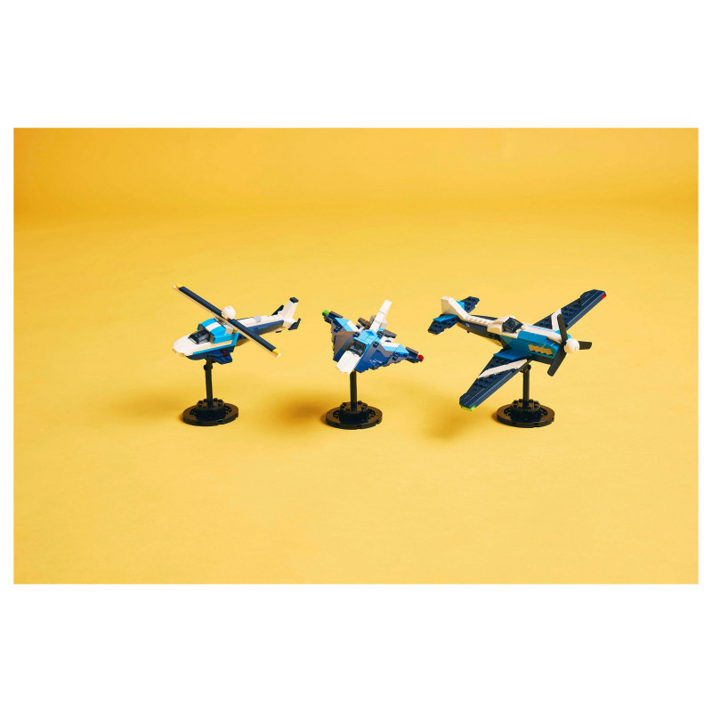 Kids can choose to build 3 different awesome vehicles: an airplane toy with a rotating propeller and moving wheels; a jet plane toy with moving wheels; and a helicopter model with a spinning rotor blade. Each model can be displayed on a brick-built stand and the set is an impressive gift for kids who enjoy playing out imaginative action-packed stories.
