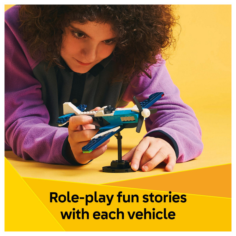 3 kids’ toy vehicles in 1 box – LEGO® Creator 3in1 Aircraft: Race Plane toy playset lets boys and girls aged 7 and over build and rebuild 3 different vehicles with the same bricks