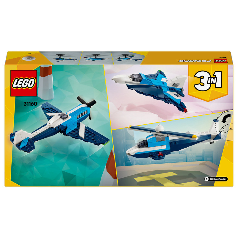 "LEGO Creator Aircraft: Race Plane. Product type: Building set, Recommended age (min): 7 yr(s), Material: Plastic, Number of pieces: 178 pc(s). Package weight: 322 g"\n"Superfast adventures in the sky await boys and girls aged 7 plus with the LEGO® Creator 3in1 Aircraft: Race Plane (31160) toy playset. The plane model has a rotating propeller at the front, moving wheels so it can travel on the ground, and a brick-built stand for display.