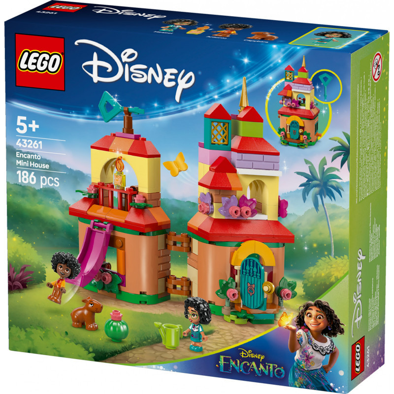 "LEGO Encanto Mini House. Product type: Building set, Recommended age (min): 5 yr(s), Material: Plastic, Number of pieces: 186 pc(s). Package weight: 289 g"\n"Give any fan of imaginative fantasy play aged 5 and over a treat with this high-quality LEGO® ǀ Disney Encanto Mini House (43261) film gift. The buildable micro-world playset is a small set with a big world inside and out, opening to reveal several areas for creative storytelling. There are also 3 LEGO® ǀ Disney characters, a slide and other story starters. After playtime, the micro-Madrigal house building model can be closed and locked with the key, making it a good size for on-the-go portable fun.