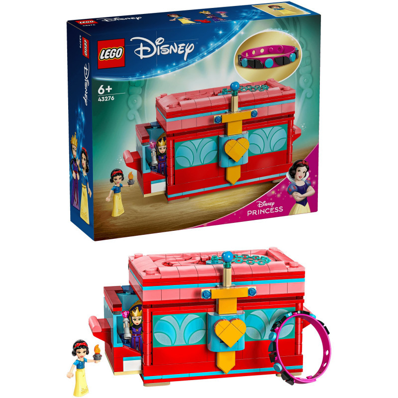 "LEGO Snow White's Jewellery Box. Product type: Building set, Recommended age (min): 6 yr(s), Material: Plastic, Number of pieces: 358 pc(s). Package weight: 665 g"\n"Delight kids and Disney fans aged 6+ with the premium gift of this LEGO® ǀ Disney Snow White’s Jewellery Box (43276) buildable toy playset. It features a box with an opening lid and handles on each side that pull open to reveal hidden rooms, a sword and chain lock, Snow White and the Evil Queen LEGO ǀ Disney mini-doll figures and a colourful bracelet with plenty of decorating elements to design, wear or share.
