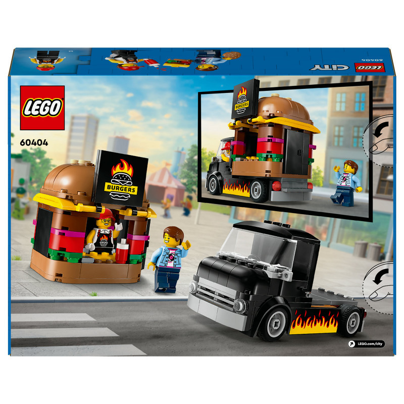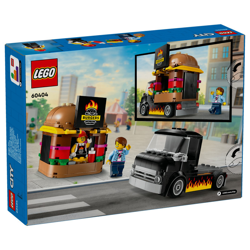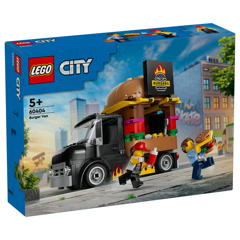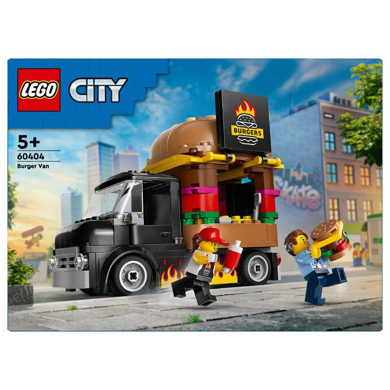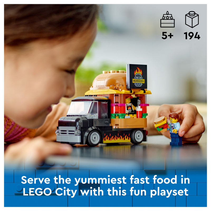 "LEGO City Burger Van. Product type: Building set, Recommended age (min): 5 yr(s), Material: Plastic, Number of pieces: 194 pc(s). Package weight: 372 g"\n"This LEGO® City Burger Van (60404) toy playset for ages 5 and over is a treat for young imaginations. Topped with a giant burger, the mobile fast-food joint can be detached from the van and comes with a detailed food prep area, condiments and a service hatch that opens to display a flame-grilled burger sign. This set also includes a vendor minifigure and a customer minifigure with a cochlear implant.