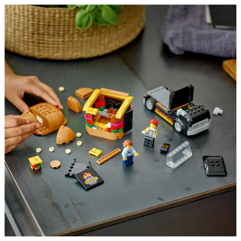 What’s in this toy vehicle building set? – Everything kids need to construct a burger van, a vendor minifigure and a customer minifigure with a cochlear implant, plus LEGO® condiment accessories