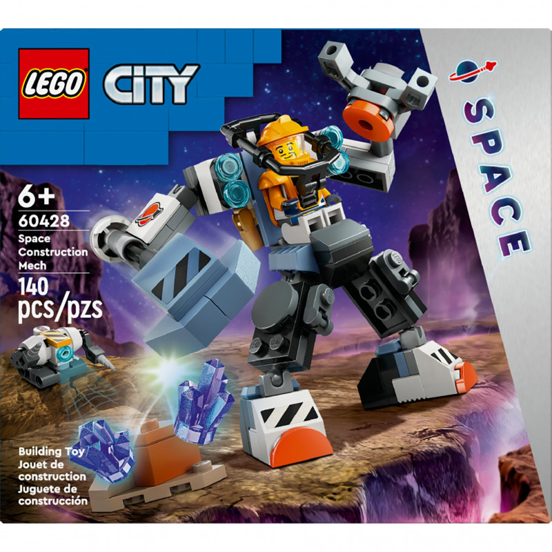 "LEGO Space Construction Mech. Product type: Building set, Recommended age (min): 6 yr(s), Material: Plastic, Number of pieces: 140 pc(s). Package weight: 148 g"\n"Launch kids’ play into orbit with the LEGO® City Space Construction Mech (60428) for boys and girls aged 6 and over. This futuristic toy mech suit comes with hammer and claw tool arms, a minifigure pilot cockpit and big feet for exploring distant planets. Just add the construction bot, planet setting, energy crystals elements and space crew minifigure for hours of epic space action.