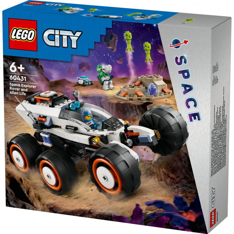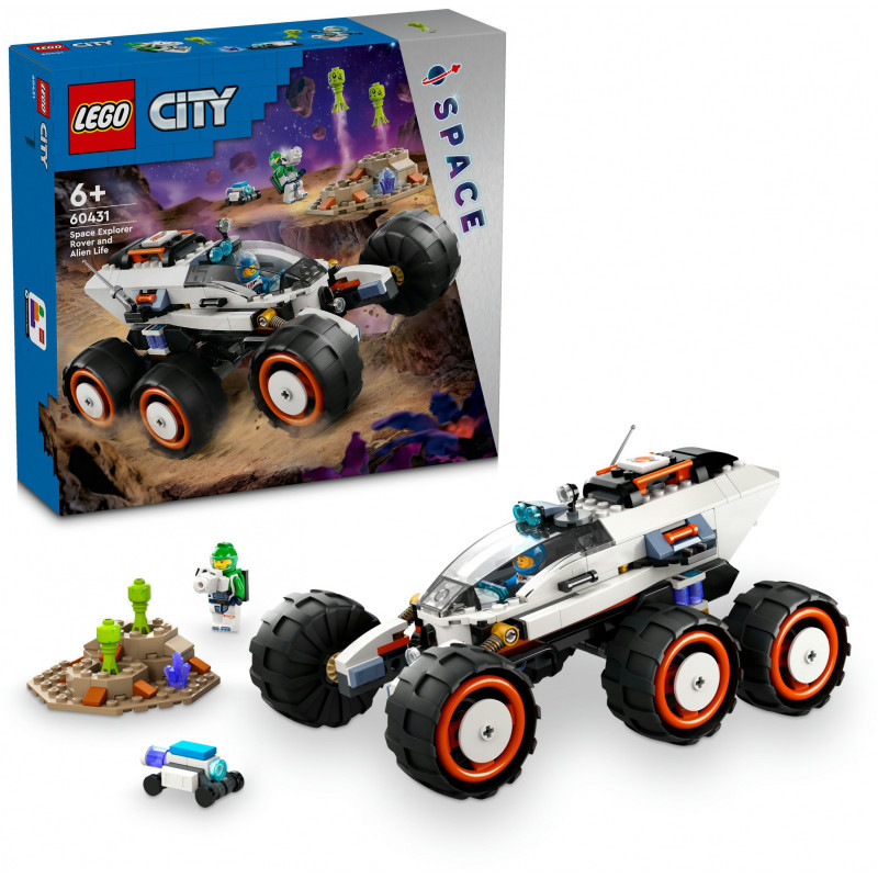 "LEGO Space Explorer Rover and Alien Life. Product type: Building set, Recommended age (min): 6 yr(s), Material: Plastic, Number of pieces: 311 pc(s). Package weight: 657 g"\n"Navigating new worlds is child’s play with this LEGO® City Space Explorer Rover and Alien Life toy playset (60431) for ages 6+. The tough space exploration vehicle is equipped with 6 big tyres and advanced suspension for cruising over rocky planet terrain. Kids can join the crew as they map the planet surface and discover strange steam-jetting geysers and alien life. This fun set includes 2 space crew minifigures, and robot and alien figures.