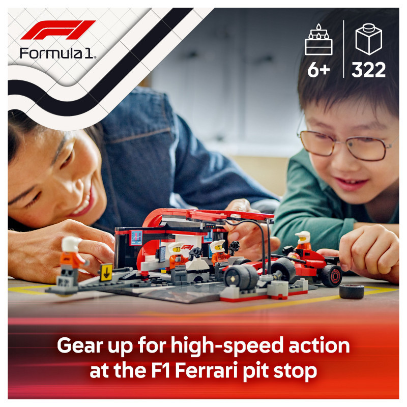 "LEGO City F1® Pit Stop & Pit Crew with Ferrari Car. Product type: Building set, Recommended age (min): 6 yr(s), Material: Plastic, Number of pieces: 322 pc(s). Package weight: 600 g"\n"Bring the thrill of the racetrack to kids’ play with the LEGO® City F1® Pit Stop & Pit Crew with Ferrari Car (60443) vehicle toy building set for ages 6 and over. This set includes everything kids need for lightning-fast pit stops, including fresh slicks, wheel guns and a crew who move into position at the flick of a switch for turbocharged tyre changes. Complete with a toy Formula 1® Ferrari race car, plus driver and 4 pit crew minifigures, this playset is fine-tuned for young racing enthusiasts.