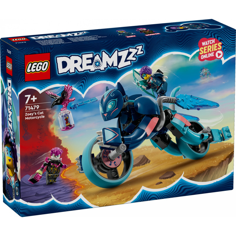 "LEGO Zoey's Cat Motorcycle. Product type: Building set, Recommended age (min): 7 yr(s), Material: Plastic, Number of pieces: 226 pc(s). Package weight: 367 g"\n"Ignite imaginations with the LEGO® DREAMZzz™ Zoey’s Cat Motorcycle (71479) bike toy. Inspired by the thrilling TV show, this rebuildable toy cat for kids lets boys and girls aged 7 and over ride into the dream world with a cool LEGO vehicle.