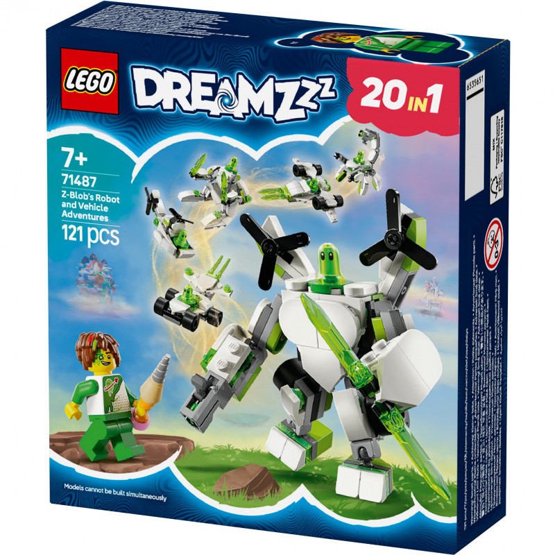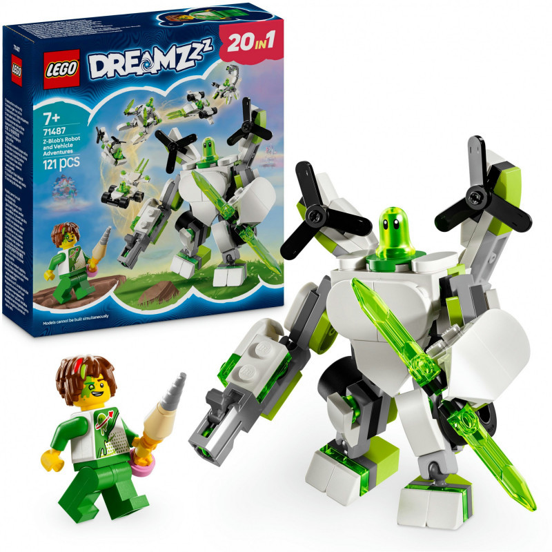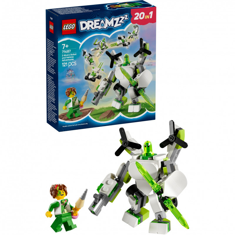 "LEGO Z-Blob's Robot and Vehicle Adventures. Product type: Building set, Recommended age (min): 7 yr(s), Material: Plastic, Number of pieces: 121 pc(s). Package weight: 144 g"\n"Ignite kids’ imaginations with this LEGO® DREAMZzz™ Z-Blob’s Robot and Vehicle Adventures (71487) building set for boys and girls aged 7 and over, which offers 20 awesome ways to build cool mech and vehicle toys.