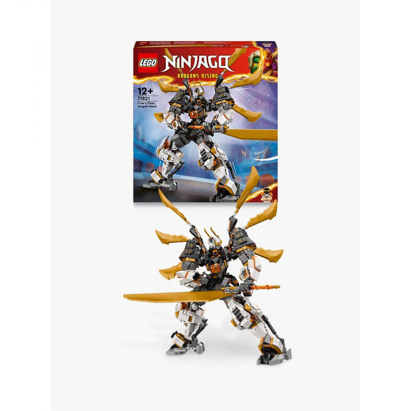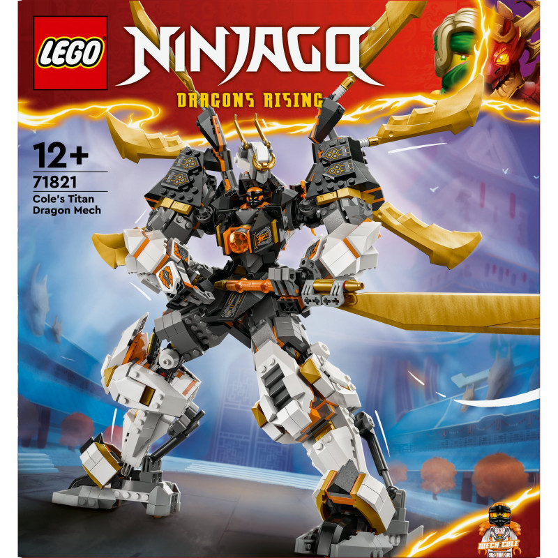 "LEGO Cole's Titan Dragon Mech. Product type: Building set, Recommended age (min): 12 yr(s), Material: Plastic, Number of pieces: 1055 pc(s). Package weight: 1.46 kg"\n"Cole’s Titan Dragon Mech (71821) adventure toy lets boys and girls aged 12+ play out action scenes from season 2 of the NINJAGO® Dragons Rising TV show. This is the biggest-ever NINJAGO titan mech and features posable arms, legs, head, body, rotation points and joints so kids can place it into battle stances, a pair of posable dragon wings and a large sword.