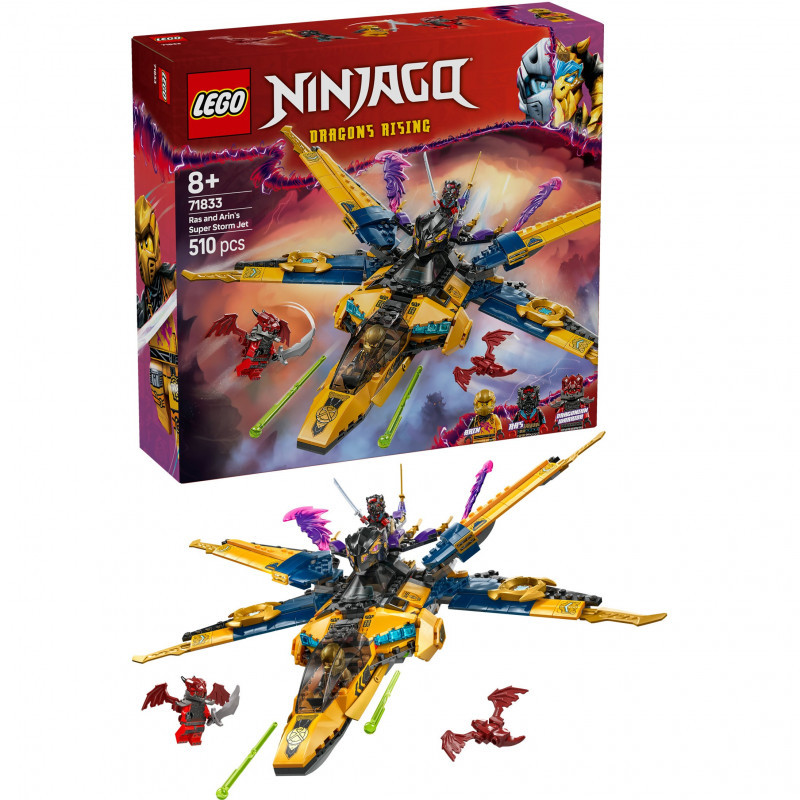 "LEGO Ras and Arin's Super Storm Jet. Product type: Building set, Recommended age (min): 8 yr(s), Material: Plastic, Number of pieces: 510 pc(s). Package weight: 752 g"\n"Boys and girls aged 8 plus can recreate scenes from season 3 of the NINJAGO® Dragons Rising TV show with Ras and Arin’s Super Storm Jet (71833). Featuring a cool jet toy with a detachable drone and escape pod, plus Arin, Ras and Dragonian Warrior minifigures and a mini dragon model, this incredible LEGO® building set comes with all kids need to enjoy countless hours of role play.