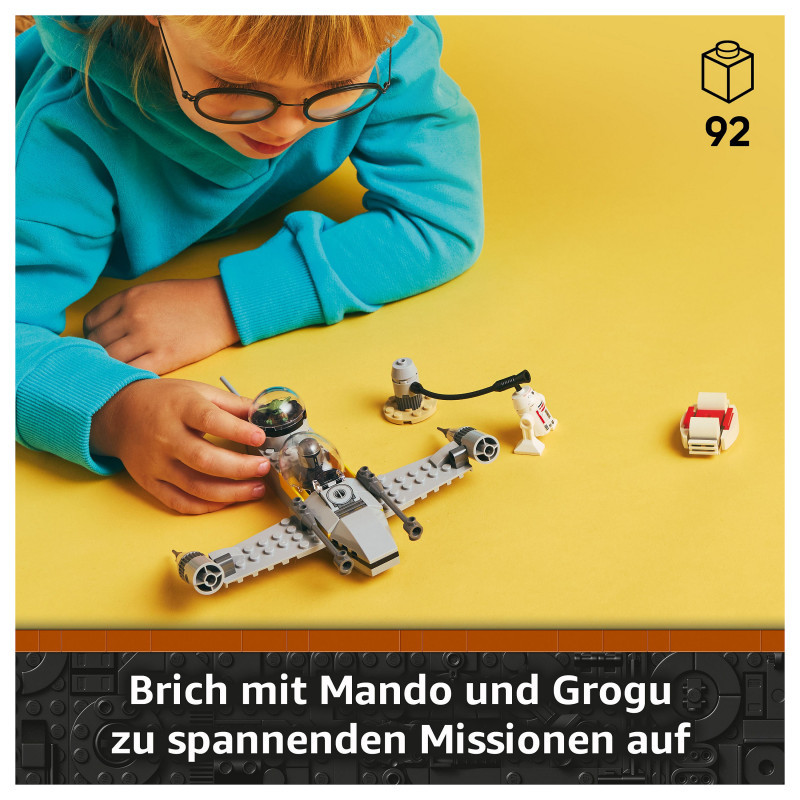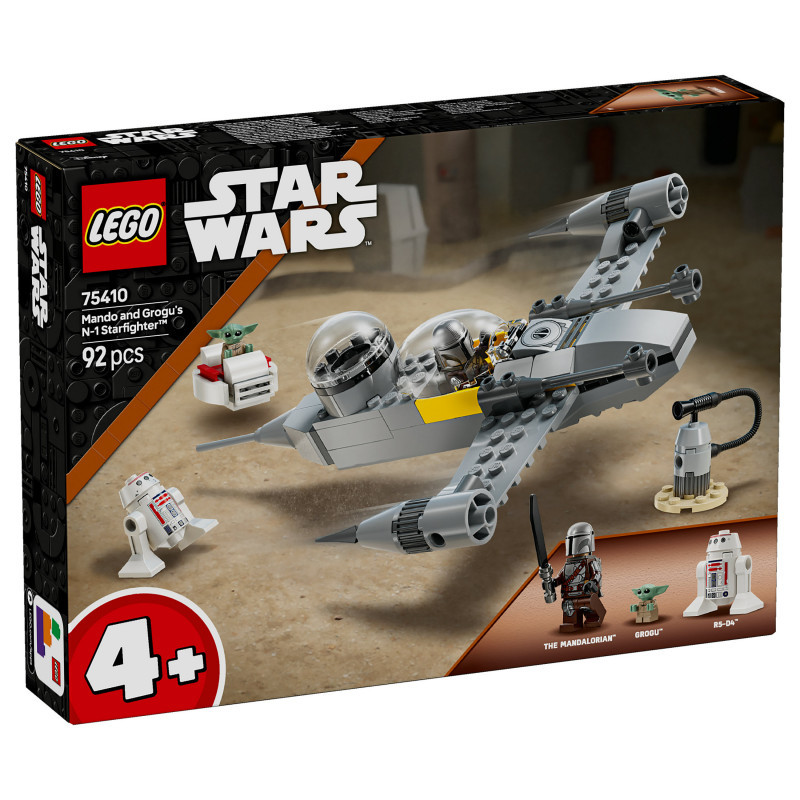 "LEGO Star Wars Mando and Grogu's N-1 Starfighter™. Product type: Building set, Recommended age (min): 4 yr(s), Material: Plastic, Number of pieces: 92 pc(s). Package weight: 245 g"\n"Learn to build with LEGO® bricks and play out Star Wars: The Mandalorian™ Season 3 fantasy stories with Mando and Grogu’s N-1 Starfighter buildable toy playset (75410) for preschoolers. A fun everyday Star Wars™ gift for boys, girls and fans aged 4 plus, the N-1 Starfighter has a Starter Brick base to give kids a head start with the build, and it comes with a buildable fuelling station.