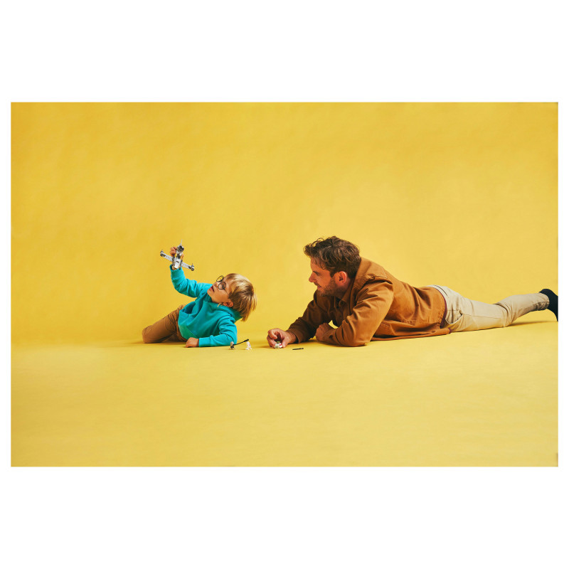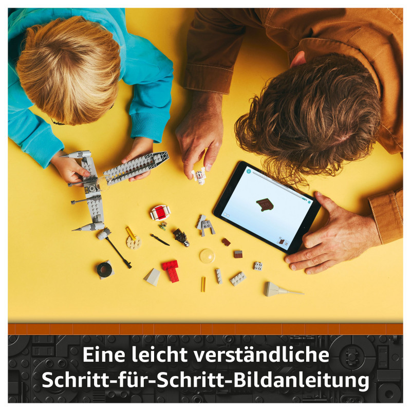 Simple vehicle model building kit for young kids – The Star Wars™ Starfighter features a Starter Brick base for easy building, an opening cockpit for The Mandalorian and a passenger space for Grogu