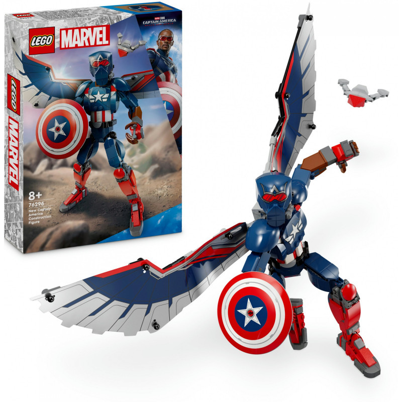 "LEGO New Captain America Construction Figure. Product type: Building set, Recommended age (min): 8 yr(s), Material: Plastic, Number of pieces: 359 pc(s). Package weight: 435 g"\n"Put Marvel movie action into the hands of young Super Heroes with the authentically detailed, fully jointed LEGO® Marvel New Captain America Construction Figure (76296) for kids aged 8 and over. For this incarnation of the Marvel super soldier, the winged Falcon takes on the role of Captain America, bringing an extra dimension to kids’ play experience.