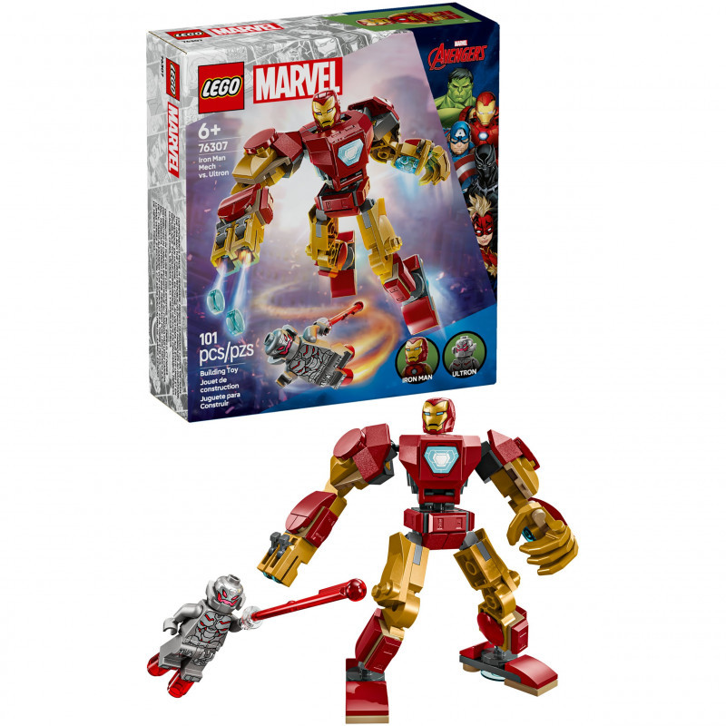 "LEGO Iron Man Mech vs. Ultron. Product type: Building set, Recommended age (min): 6 yr(s), Material: Plastic, Number of pieces: 101 pc(s). Package weight: 141 g"\n"Iron Man Mech vs. Ultron (76307) is an action-packed, buildable LEGO® Marvel playset for kids aged 6 and over who enjoy Super Heroes and hands-on construction adventure toys.