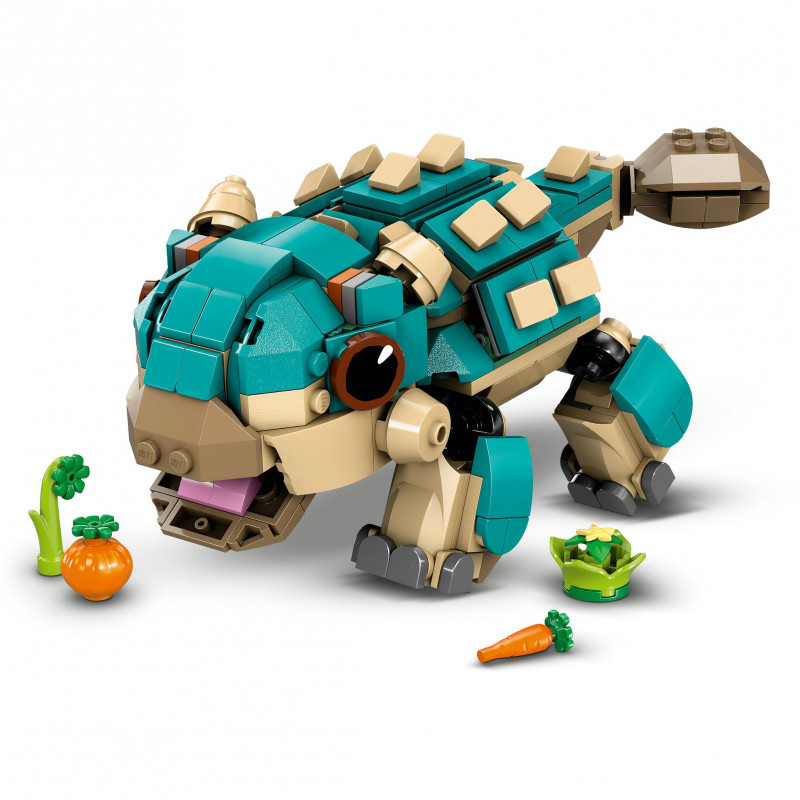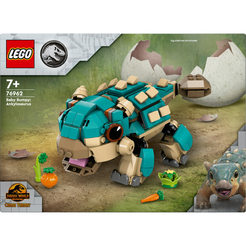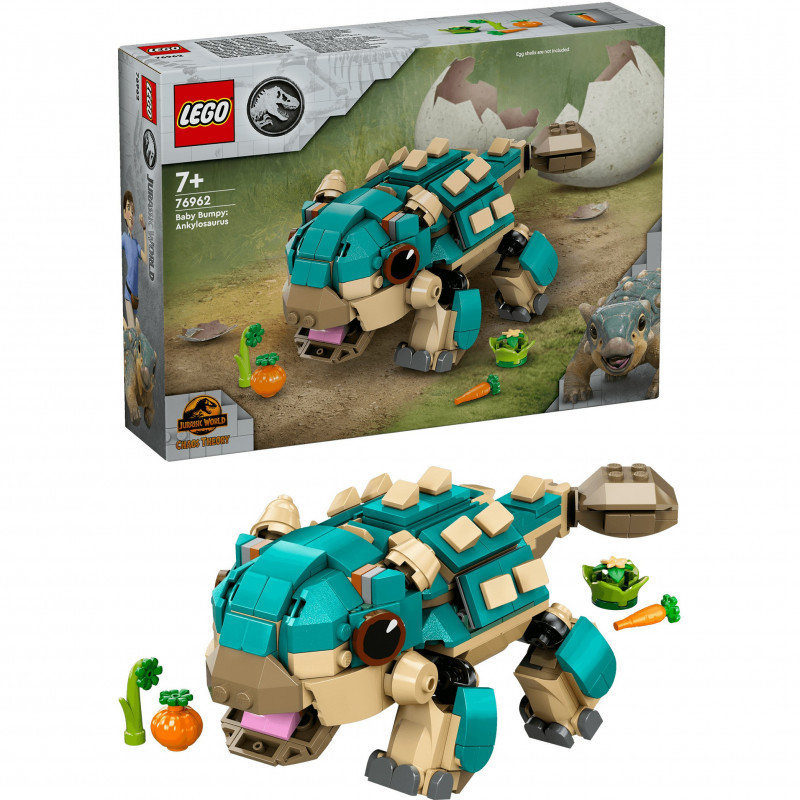 "LEGO Baby Bumpy: Ankylosaurus. Product type: Building set, Recommended age (min): 7 yr(s), Material: Plastic, Number of pieces: 358 pc(s). Package weight: 373 g"\n"Inspire fans of the Camp Cretaceous TV show with a Baby Bumpy: Ankylosaurus dinosaur toy (76962) model full of play-and-display adventure possibilities. First, young dinosaur tenders aged 7+ build this LEGO® Jurassic World set, then they dive into play as they start exploring the world with Bumpy. The build-a-dinosaur adventure set figure includes an opening jaw, articulated tail that waggles when the head moves from side to side, articulated legs and some vegetables. Once play is over, display the fun dinosaur gift in different dynamic poses on a shelf or table.