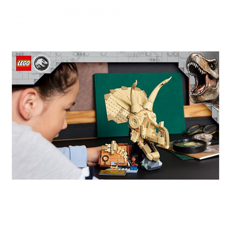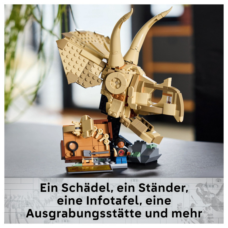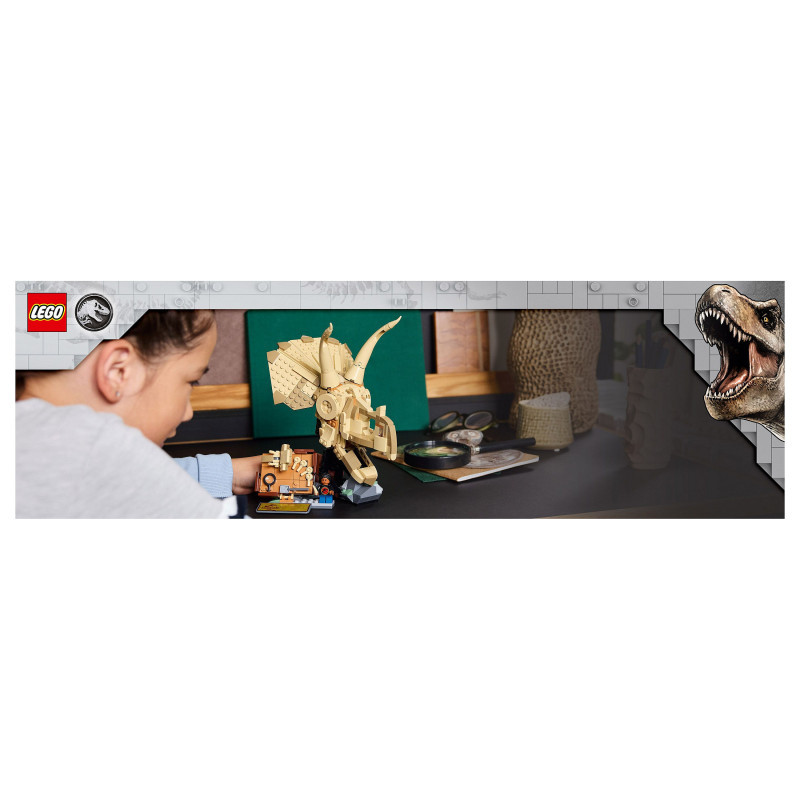 "LEGO Jurassic World Dinosaur Fossils: Triceratops Skull. Product type: Building set, Recommended age (min): 9 yr(s), Material: Plastic, Number of pieces: 468 pc(s). Package weight: 635 g"\n"Young palaeontologists aged 9 and over can enjoy imaginative Jurassic World play by collecting dinosaur fossils with this Dinosaur Fossils: Triceratops Skull (76969) LEGO® Jurassic World building kit. This model playset in the Dinosaur Fossils display series features a Triceratops skull with an opening jaw, a stand with a rock base, a dig site plate with mini-fossils and excavating tools, a LEGO minifigure, an information plaque and an ‘amber’ piece with an encased mosquito.