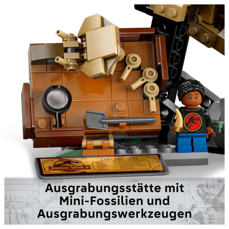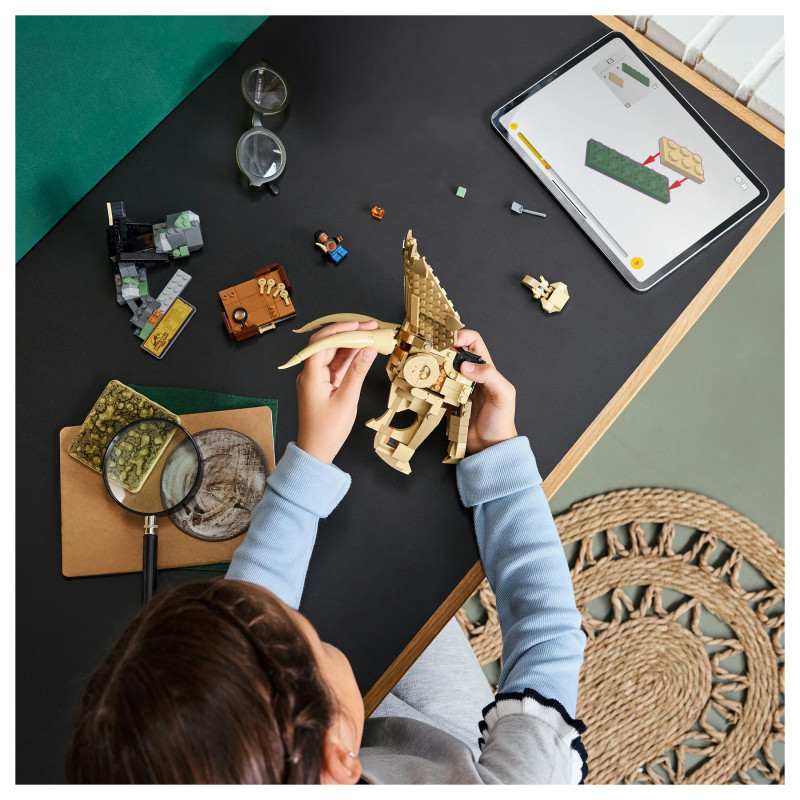 Dinosaur building kit – Has a Triceratops skull with a stand, informational plaque, dig site plate with mini-fossils and excavating tools, Junior Palaeontologist LEGO® minifigure and an ‘amber’ piece