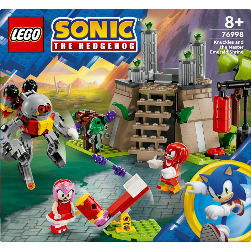 "LEGO Knuckles and the Master Emerald Shrine. Product type: Building set, Recommended age (min): 8 yr(s), Material: Plastic, Number of pieces: 325 pc(s). Package weight: 509 g"\n"Thrill video game fans aged 8+ with adventure and heroes in this Knuckles and the Master Emerald Shrine (76998) buildable set. The LEGO® Sonic the Hedgehog™ collectible toy includes a shrine with 4 Chaos Emeralds, Knuckles’ quarters beneath the shrine with workout area, a rotating floor and a grapevine, Amy’s hammer and a catapult to launch grapes at the Eggrobo. This fun gamer gift features 4 characters: Knuckles and Amy minifigures, a posable Eggrobo Badnik with a jet pack and stud launcher, and a Picky.