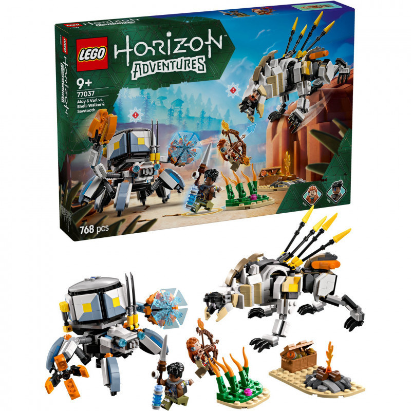 "LEGO Aloy & Varl vs. Shell-Walker & Sawtooth. Product type: Building set, Recommended age (min): 9 yr(s), Material: Plastic, Number of pieces: 768 pc(s). Package weight: 643 g"\n"LEGO® Horizon Adventures™ Aloy & Varl vs. Shell-Walker & Sawtooth (77037) is a collectible fantasy gaming toy for kids aged 9 and over.